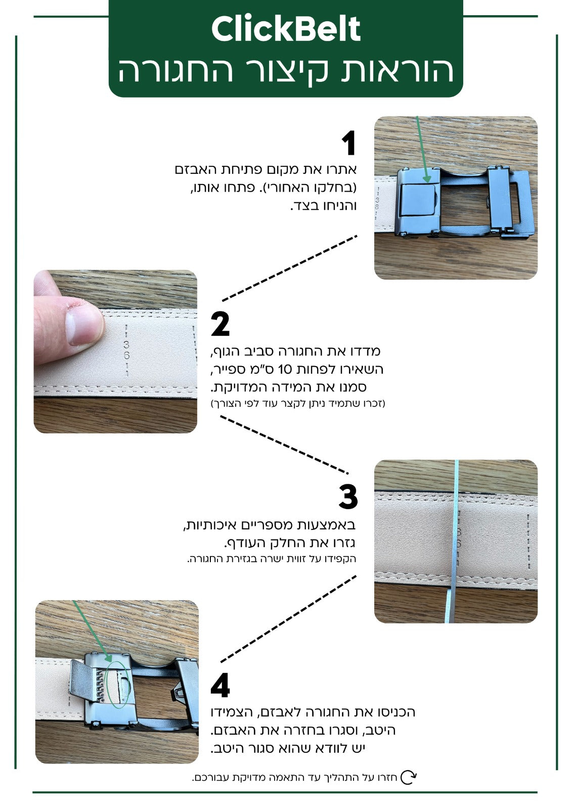 החגורה מתאימה לכל מידה ומגיעה באורך אחד שניתן לקצר לבד מהבית בקלות. אם קיבלתם את החגורה והמידה גדולה, באפשרותכם לקצר אותה תוך 30 שניות: